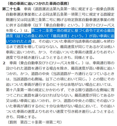 第22条第1項の規定に基づく政令で定める最高速度(以下この条において「最高速度」という。)が高い車両に追いつかれたときは、