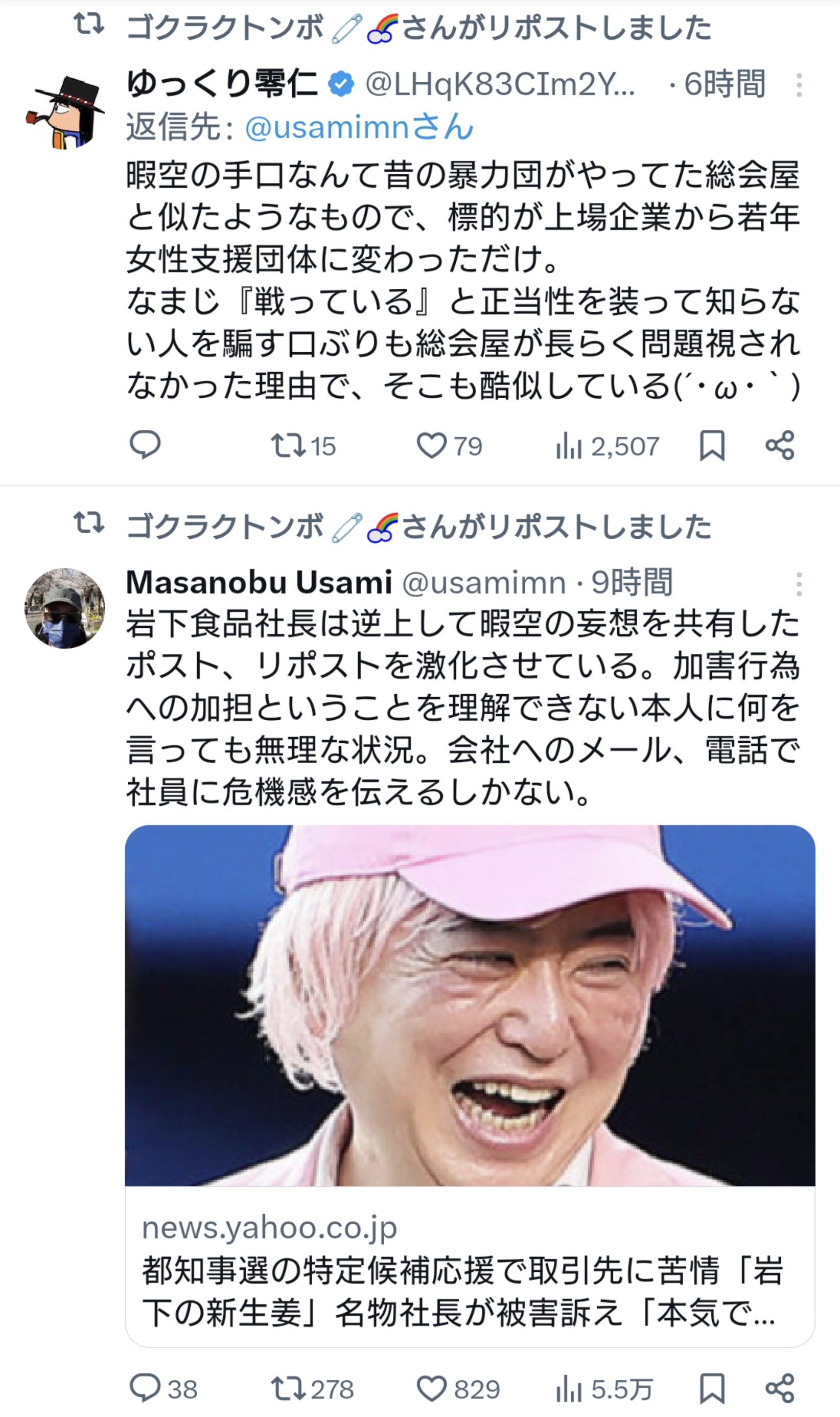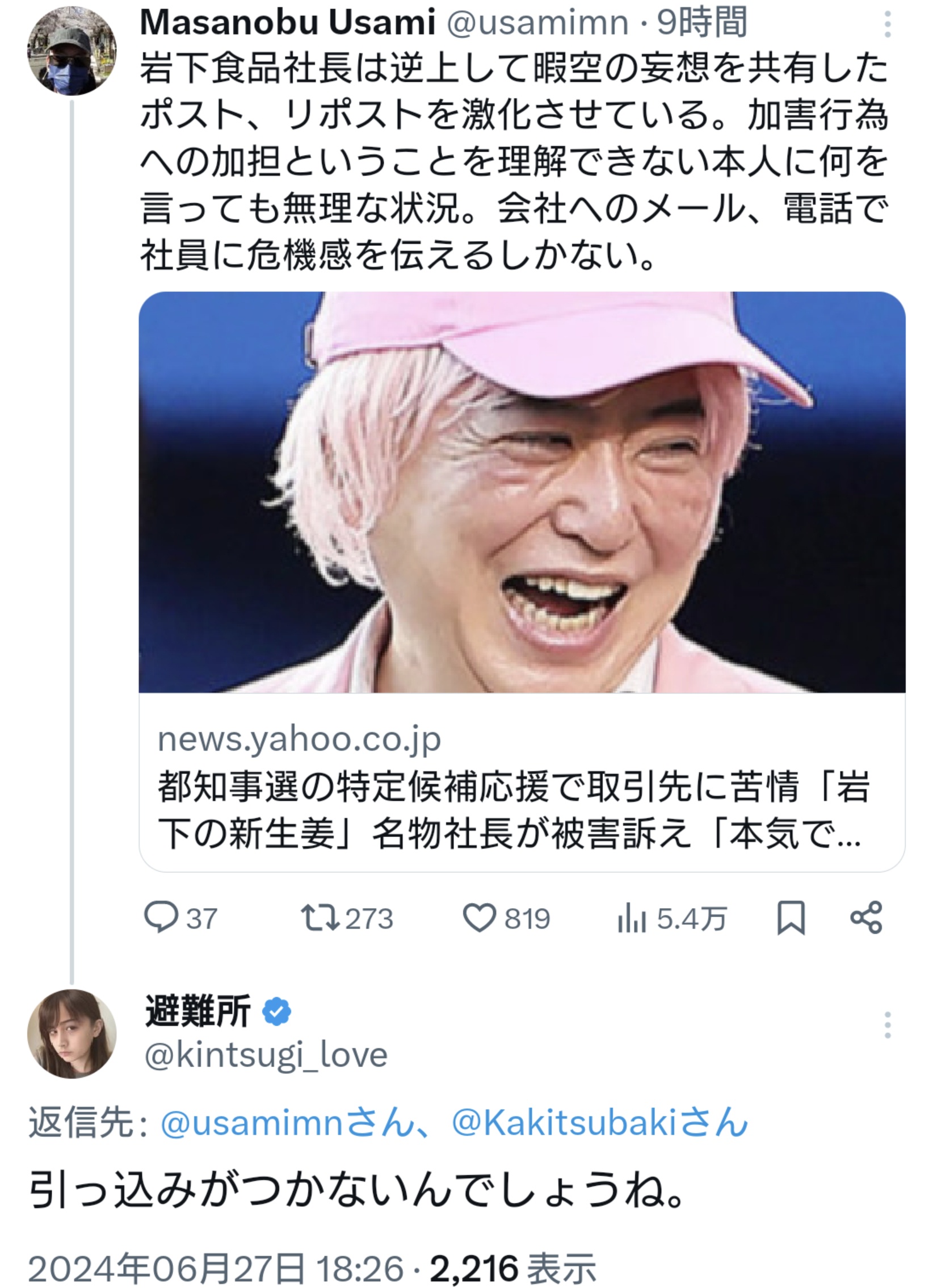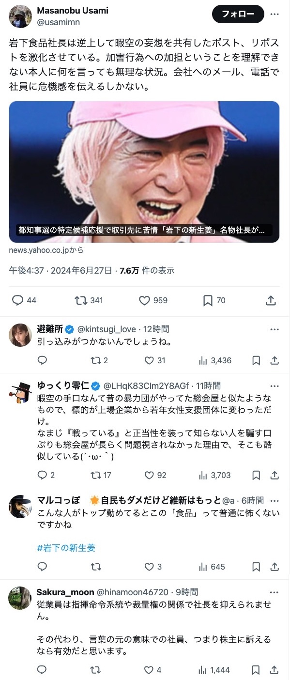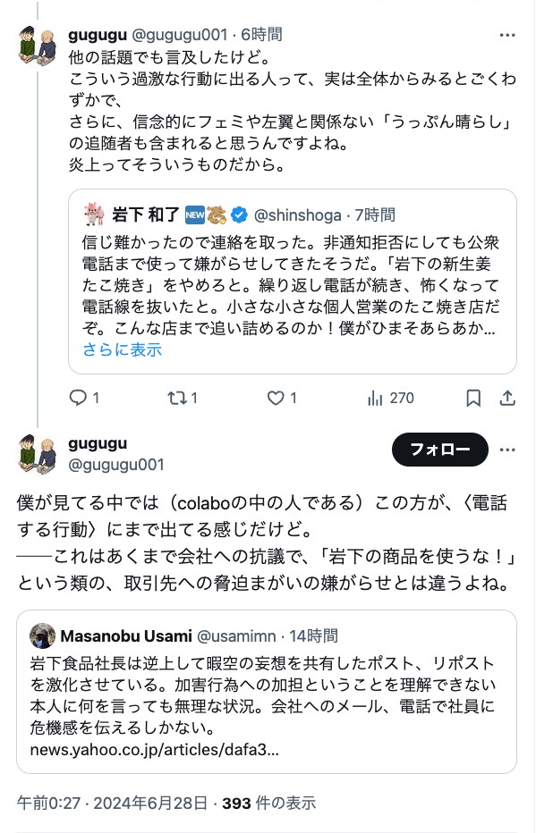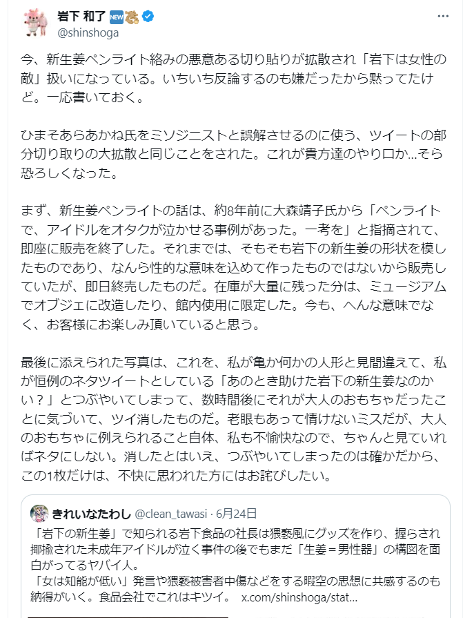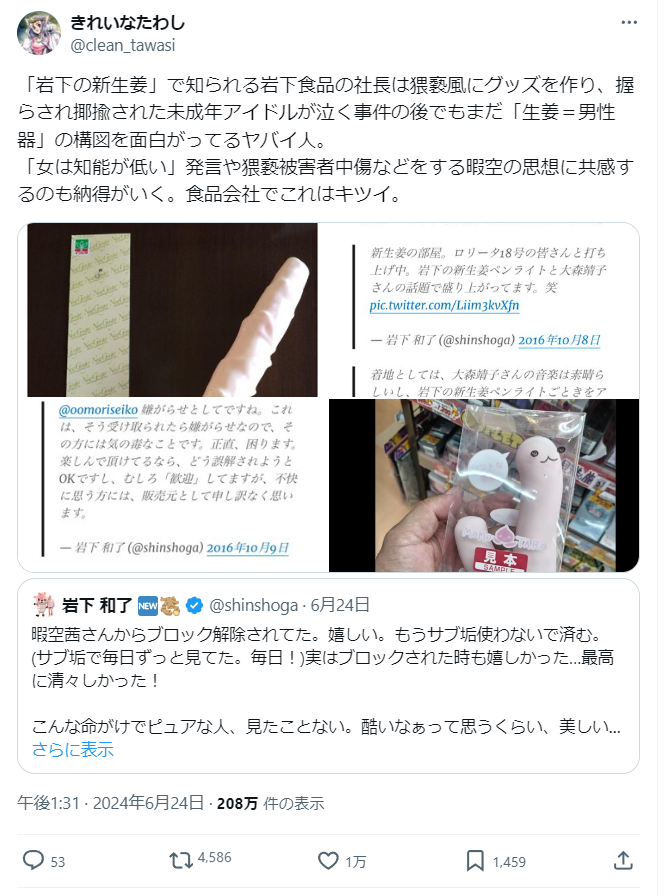 【岩下の新生姜社長強い!】ひまそらあかね氏を応援した岩下の新生姜の社長が警察へ行くとなったら被害者面で言い訳やライン超えがワラワラ