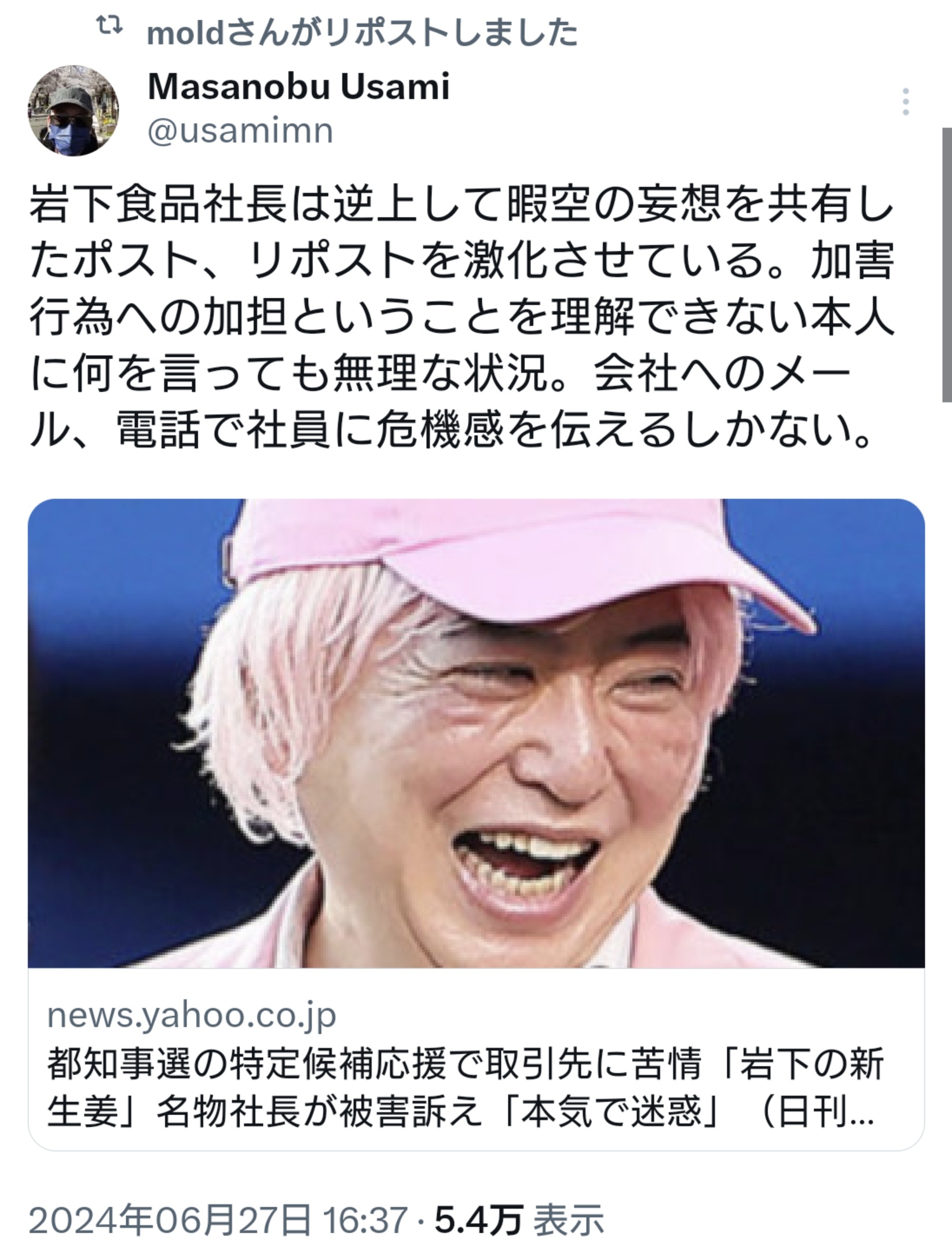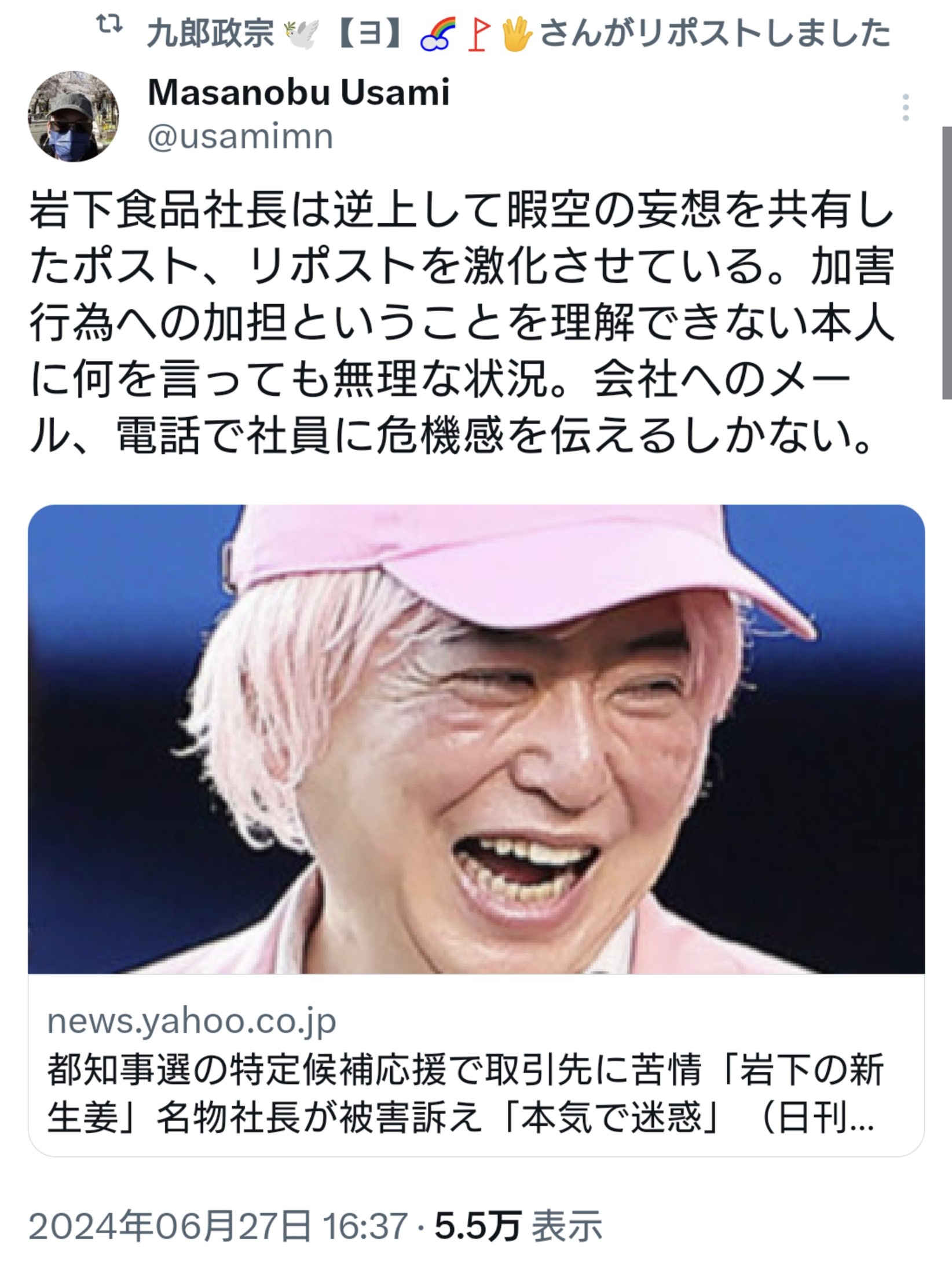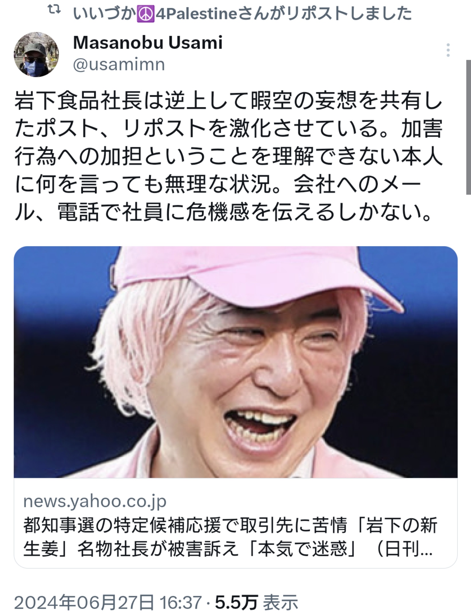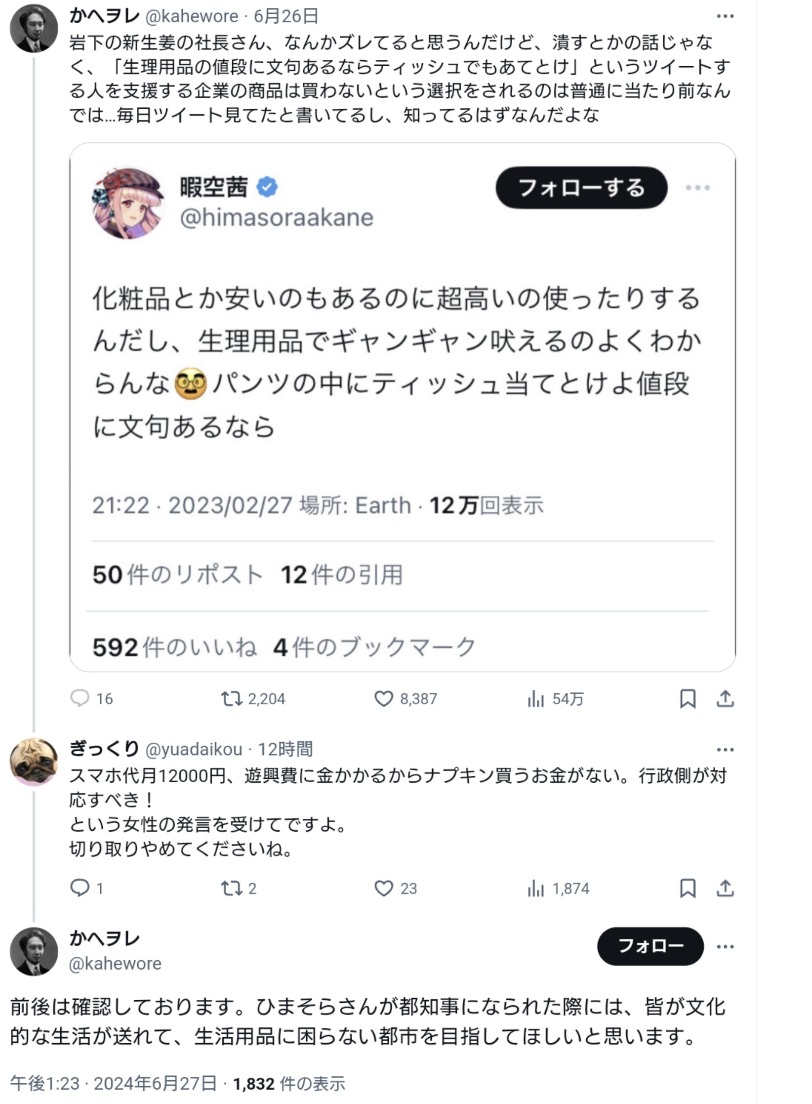【岩下の新生姜社長強い!】ひまそらあかね氏を応援した岩下の新生姜の社長が警察へ行くとなったら被害者面で言い訳やライン超えがワラワラ
