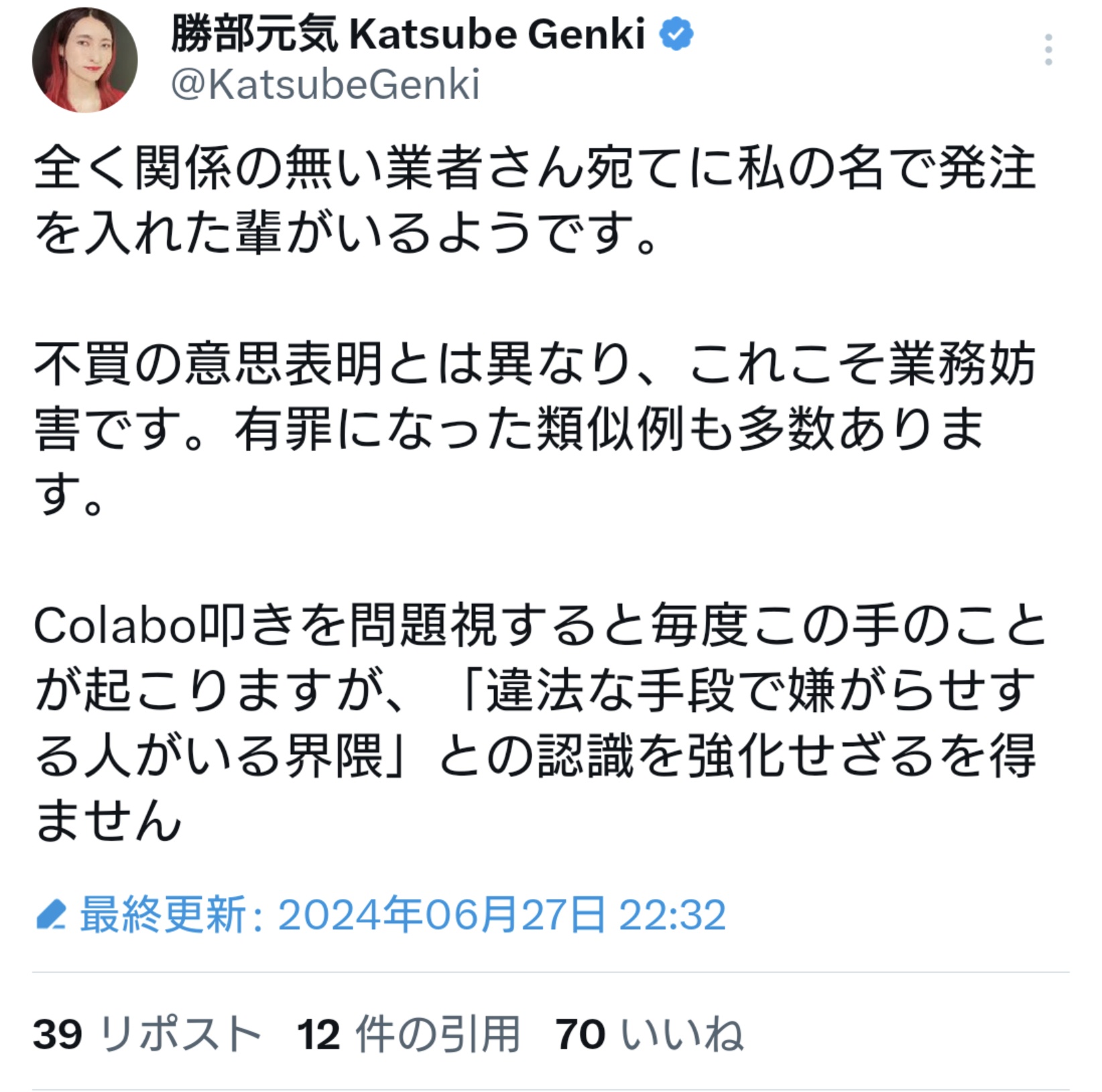 約2年観戦してきて、「嘘をつかない」「決めたことはやり切る」においてこれほど信用出来る人はいません。圧力をかけられても◯害予告されても書類送検をされてもブレずに突き進んだ人です。