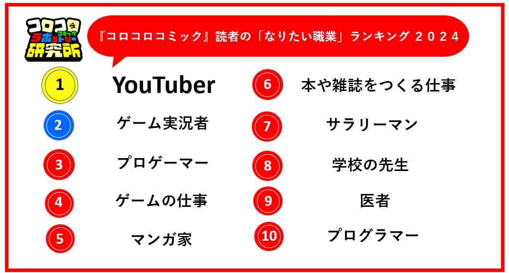 調査のうち、「コロコロコミック」読者の「なりたい職業」を聞いたところ、1位は「YouTuber」。次いで、2位が「ゲーム実況者」、3位が「プロゲーマー」、4位が「ゲームの仕事」、5位が「マンガ家」となった。