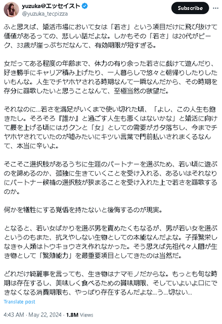 有識者「婚活において女の価値は若さだけ」→女さん阿鼻叫喚 2024年5月23日 最終更新日時 : 2024年5月23日 admin 【MLB 】大谷翔平、2試合ぶりの46号ホームランで自己最多タイに!記録を46-46に更新!! 中国で増加する「無敵の人」 もう何も怖くない「無敵の人」による捨て鉢な犯罪が増加している [9/8] [昆虫図鑑★] 【MHWilds】モンスターハンターワイルズ 各メーカーの記事から気になる内容をまとめて紹介 【ウマ娘】カフェ『当店は喫茶店だと何度も…ご注文のオグリカツ丼です』 【釣具屋】ダイソー、環境配慮型ルアーを発売 開発に1年、植物由来の原料を採用 【芸能】山本彩(31)マネジャー撮影の全身ショットが 【有能】ワイ、YouTubeの切り抜き動画で200万稼いでしまうwwwww 【衝撃】3大避けるべき賃貸物件の特徴「木造」「1階」→あとは『これ』wwwww 【衝撃】ワイ、ハンターカブを契約してきた結果wwwww 『ジェラルド・ウィギンス』 有識者「婚活において女の価値は若さだけ」→女さん阿鼻叫喚 1: 名無しさん@おーぷん 24/05/22(水) 20:53:41 ID:7Qpv 男からすると若さという誰でも手に入る武器で戦えるの羨ましすぎるんやが男は何か積み上げん限り無理やし 続きを読む 続きを見る 【MLB 】大谷翔平、2試合ぶりの46号ホームランで自己最多タイに!記録を46-46に更新!! 中国で増加する「無敵の人」 もう何も怖くない「無敵の人」による捨て鉢な犯罪が増加している [9/8] [昆虫図鑑★] 【MHWilds】モンスターハンターワイルズ 各メーカーの記事から気になる内容をまとめて紹介 【ウマ娘】カフェ『当店は喫茶店だと何度も…ご注文のオグリカツ丼です』 【釣具屋】ダイソー、環境配慮型ルアーを発売 開発に1年、植物由来の原料を採用 【芸能】山本彩(31)マネジャー撮影の全身ショットが 【有能】ワイ、YouTubeの切り抜き動画で200万稼いでしまうwwwww 【衝撃】3大避けるべき賃貸物件の特徴「木造」「1階」→あとは『これ』wwwww 関連記事 関連記事はありません。