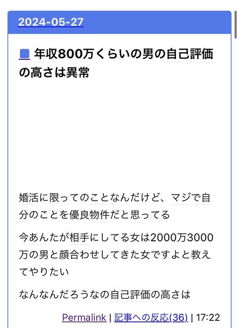 婚活まんさん「年収800万くらいの男の自己評価の高さは異常。あたしは年収3000万の男と顔合わせしてきた女だぞ……!」 2024年5月31日 最終更新日時 : 2024年5月31日 admin 【MLB 】大谷翔平、2試合ぶりの46号ホームランで自己最多タイに!記録を46-46に更新!! 中国で増加する「無敵の人」 もう何も怖くない「無敵の人」による捨て鉢な犯罪が増加している [9/8] [昆虫図鑑★] 【MHWilds】モンスターハンターワイルズ 各メーカーの記事から気になる内容をまとめて紹介 【ウマ娘】カフェ『当店は喫茶店だと何度も…ご注文のオグリカツ丼です』 【釣具屋】ダイソー、環境配慮型ルアーを発売 開発に1年、植物由来の原料を採用 【芸能】山本彩(31)マネジャー撮影の全身ショットが 【有能】ワイ、YouTubeの切り抜き動画で200万稼いでしまうwwwww 【衝撃】3大避けるべき賃貸物件の特徴「木造」「1階」→あとは『これ』wwwww 【衝撃】ワイ、ハンターカブを契約してきた結果wwwww 『ジェラルド・ウィギンス』 婚活まんさん「年収800万くらいの男の自己評価の高さは異常。あたしは年収3000万の男と顔合わせしてきた女だぞ……!」 1: 名無しさん@おーぷん 24/05/29(水) 13:36:54 ID:LuvB つよい 続きを読む 続きを見る 【MLB 】大谷翔平、2試合ぶりの46号ホームランで自己最多タイに!記録を46-46に更新!! 中国で増加する「無敵の人」 もう何も怖くない「無敵の人」による捨て鉢な犯罪が増加している [9/8] [昆虫図鑑★] 【MHWilds】モンスターハンターワイルズ 各メーカーの記事から気になる内容をまとめて紹介 【ウマ娘】カフェ『当店は喫茶店だと何度も…ご注文のオグリカツ丼です』 【釣具屋】ダイソー、環境配慮型ルアーを発売 開発に1年、植物由来の原料を採用 【芸能】山本彩(31)マネジャー撮影の全身ショットが 【有能】ワイ、YouTubeの切り抜き動画で200万稼いでしまうwwwww 【衝撃】3大避けるべき賃貸物件の特徴「木造」「1階」→あとは『これ』wwwww 関連記事 関連記事はありません。