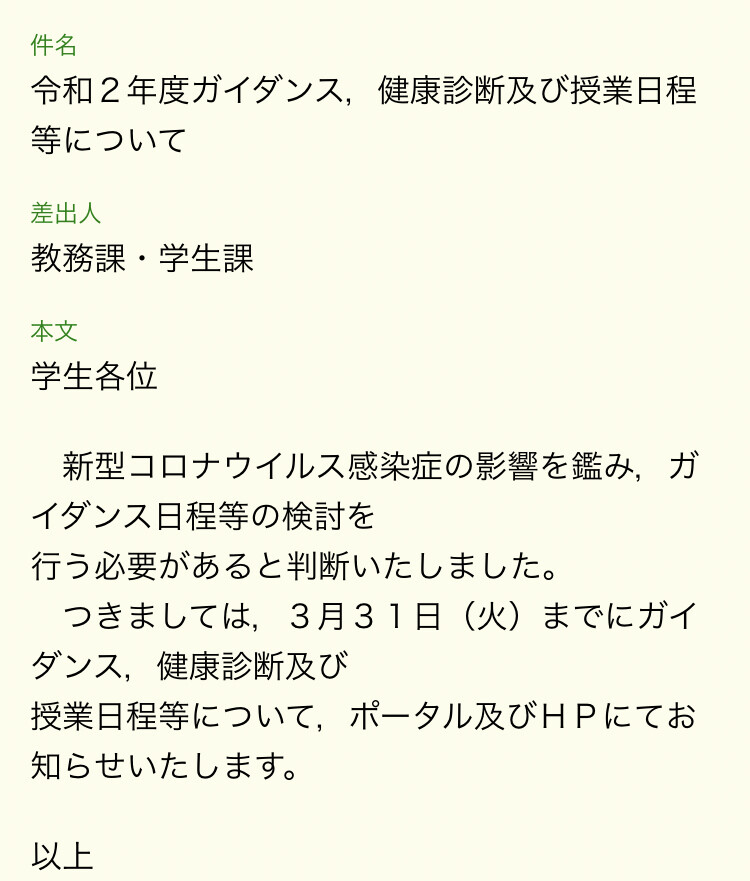 ワイ大は全体で流す授業開始延期の連絡をある学部がフライングして流してて草生えたわ