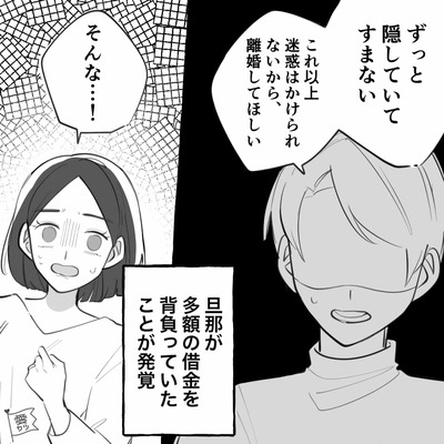 主人公の夫に多額の借金があることが発覚しました。 夫から「離婚して」と提案され、別れることになったのですが…。 出典:愛カツ