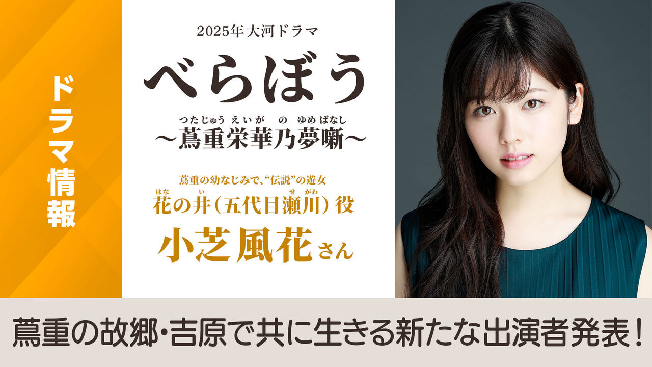 小芝は「今回、蔦重の幼なじみであり、伝説の遊女である『花の井』を演じさせていただきます。私は大河ドラマに出演させていただくのも初めてなのですが、”伝説の遊女”ということで余計に緊張しております。凛と美しくもあり、時にはバシッと蔦重の背中を押すような男前さも持ち合わせている花の井を、精一杯演じたいと思います」とコメントした。