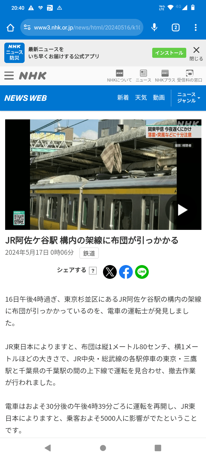 JR阿佐ケ谷駅 構内の架線に布団が引っかかる