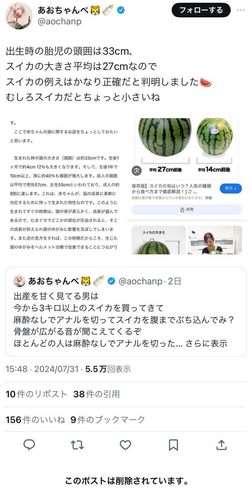 【悲報】人気モデル「出産を舐めてる男は直径33cmのスイカを産むところ想像してみろ」