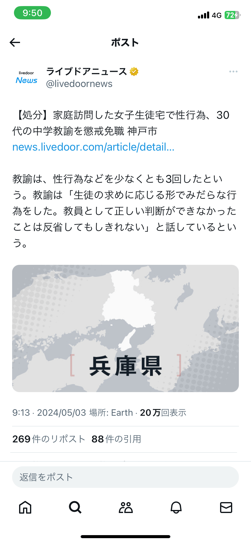 【処分】家庭訪問した女子生徒宅で性行為、30代の中学教諭を懲戒免職 神戸市