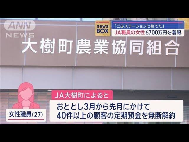 20代のJA女性職員、6700万円着服…大半は「ごみステーションに捨てた」