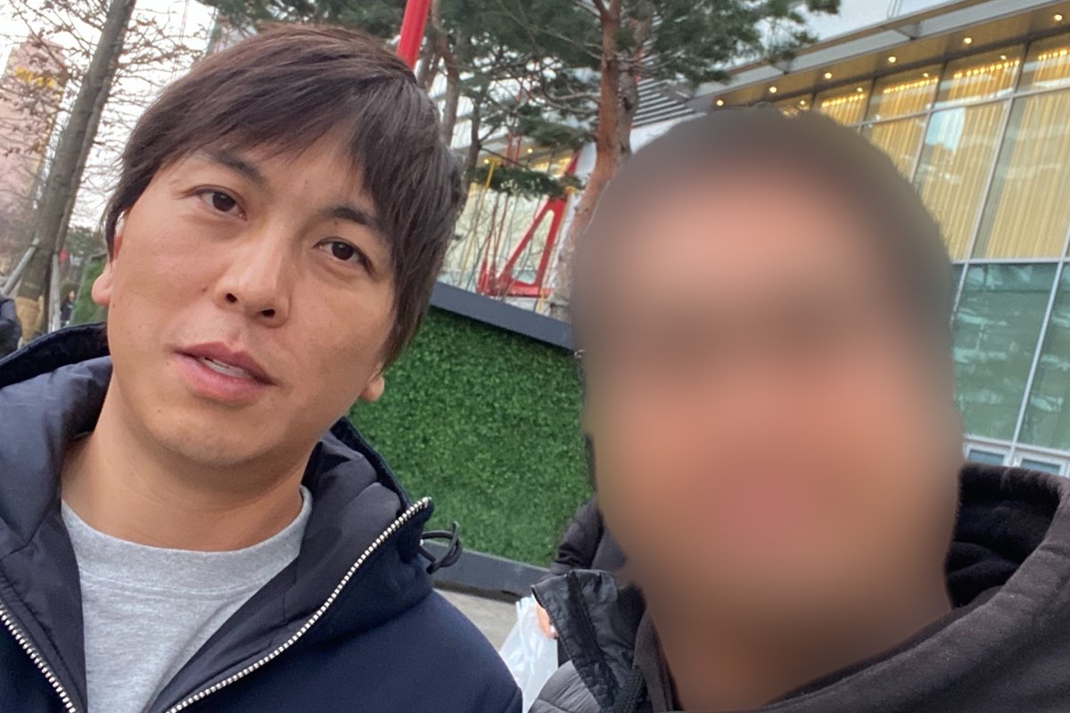 虚ろな表情でファンとのツーショットにおさまる水原一平氏(39)。この写真は、3月17日(日)18時半頃、ドジャースの大谷翔平選手(29)が宿泊していた韓国・ソウルにある5つ星ホテルの前で撮られたものだ。
