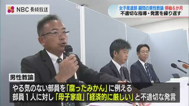 処分を受けたのは長崎市内の県立高校の46歳の男性教諭です。県の発表によりますと男性教諭はことし3月下旬~4月上旬にかけて、顧問を務める女子柔道部の部員である女子生徒に対し「学力が低い」など不適切な発言をし、その生徒ら2人が叱責を受けた後雨の中腕立て伏せをしていたことに対し、適切な措置をとらなかったということです。