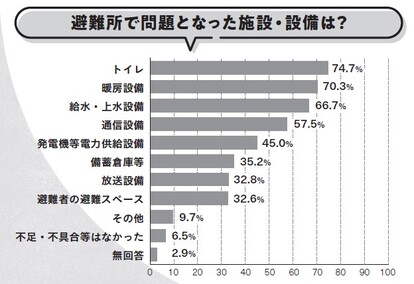 公立学校の多くは老朽化が進んでおり、設備面に課題を抱えています。東日本大震災で避難所として利用された学校を対象に文部科学省が実施した調査では、問題となった施設・設備として最も多く挙げられたのは「トイレ」で、実に74.7%に上りました。ほかには「暖房設備」(70.3%)「給水・上水設備」(66.7%)と続きます。