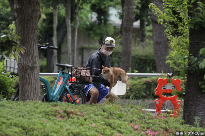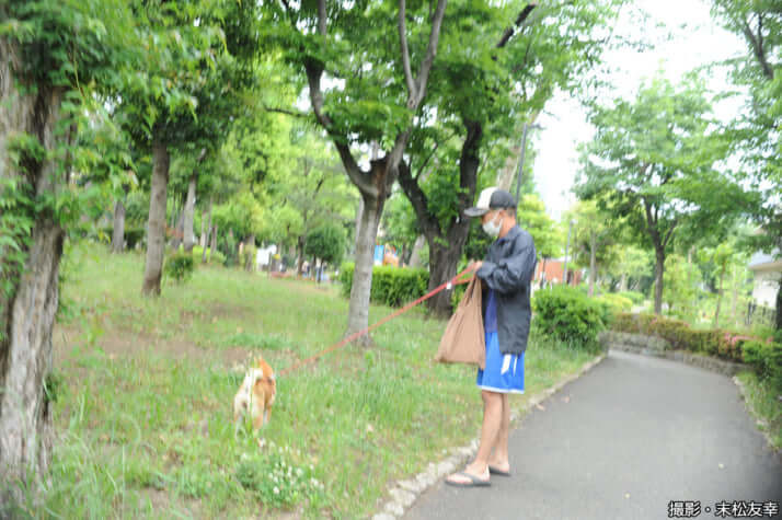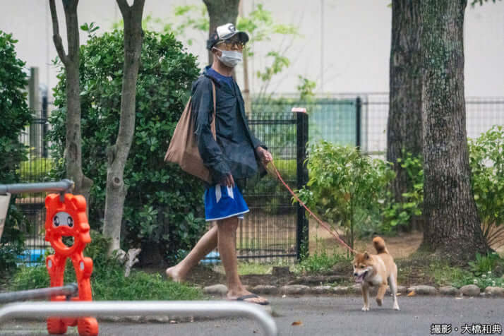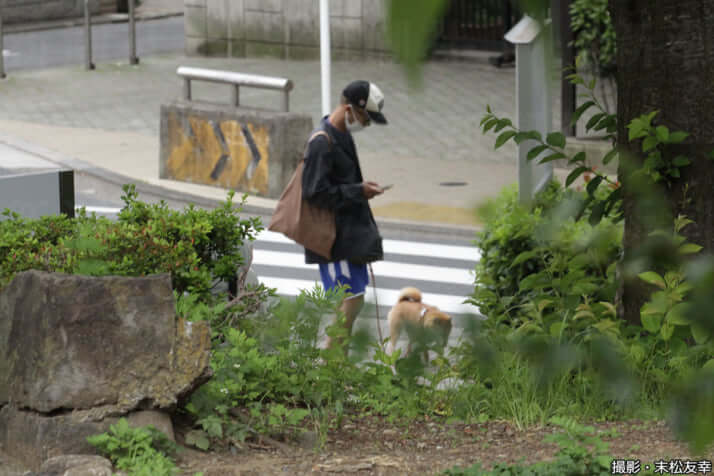 自転車の前かごに子犬を乗せて向かった先の公園は、住宅街の中にあってもひと気は少ない。近所の人が「最近犬を飼い始めたみたいで、一緒に出かけるのをよく見ますよ」と言うように、そこでおよそ2時間、園内を行ったり来たり、犬を歩かせ、自身も歩き、ときおりベンチに座っては、スマホの画面に目を落としていた。