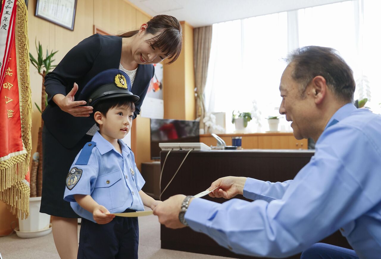 徳島市内の空き地で「あへん法」により栽培が禁止されているアツミゲシを見つけ、交番に届け出た徳島市の川村悠月ちゃん(3)に30日、徳島県警徳島板野署の笠井寿範署長から感謝状が贈られた。署長は「勇気ある行動により、町の平和が守られました」と感謝を伝えた。