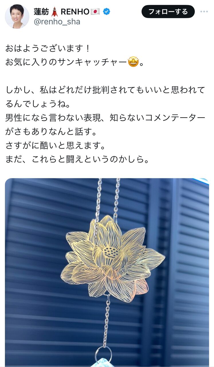 【悲報】蓮舫さん、批判コメントに怒りをあらわにする!! 2024年7月9日 最終更新日時 : 2024年7月9日 admin 【MLB 】大谷翔平、2試合ぶりの46号ホームランで自己最多タイに!記録を46-46に更新!! 中国で増加する「無敵の人」 もう何も怖くない「無敵の人」による捨て鉢な犯罪が増加している [9/8] [昆虫図鑑★] 【MHWilds】モンスターハンターワイルズ 各メーカーの記事から気になる内容をまとめて紹介 【ウマ娘】カフェ『当店は喫茶店だと何度も…ご注文のオグリカツ丼です』 【釣具屋】ダイソー、環境配慮型ルアーを発売 開発に1年、植物由来の原料を採用 【芸能】山本彩(31)マネジャー撮影の全身ショットが 【有能】ワイ、YouTubeの切り抜き動画で200万稼いでしまうwwwww 【衝撃】3大避けるべき賃貸物件の特徴「木造」「1階」→あとは『これ』wwwww 【衝撃】ワイ、ハンターカブを契約してきた結果wwwww 『ジェラルド・ウィギンス』 【悲報】蓮舫さん、批判コメントに怒りをあらわにする!! 蓮舫 蓮舫(れんほう、1967年〈昭和42年〉11月28日 – )は、日本のタレント、元グラビアアイドル、政治家。本名は齊藤 蓮舫(さいとう れんほう)。村田信之との婚姻中の間の本名は村田 蓮舫(むらた れんほう)であった。 菅直人内閣で内閣府特命担当大臣(行政刷新、消費者及び食品安全)、内閣総理大臣補佐… 157キロバイト (22,520 語) – 2024年7月9日 (火) 03:20 (出典 www.nishinippon.co.jp) (出典 【悲報】蓮舫、落選報道に激怒) 1 それでも動く名無し 警備員[Lv.18] :2024/07/09(火) 16:20:09.98 ID:JhvXlQtp0 ええ・・・ (出典 i.imgur.com) (出典 【悲報】蓮舫、落選報道に激怒) 続きを読む 続きを見る 【MLB 】大谷翔平、2試合ぶりの46号ホームランで自己最多タイに!記録を46-46に更新!! 中国で増加する「無敵の人」 もう何も怖くない「無敵の人」による捨て鉢な犯罪が増加している [9/8] [昆虫図鑑★] 【MHWilds】モンスターハンターワイルズ 各メーカーの記事から気になる内容をまとめて紹介 【ウマ娘】カフェ『当店は喫茶店だと何度も…ご注文のオグリカツ丼です』 【釣具屋】ダイソー、環境配慮型ルアーを発売 開発に1年、植物由来の原料を採用 【芸能】山本彩(31)マネジャー撮影の全身ショットが 【有能】ワイ、YouTubeの切り抜き動画で200万稼いでしまうwwwww 【衝撃】3大避けるべき賃貸物件の特徴「木造」「1階」→あとは『これ』wwwww 関連記事 関連記事はありません。