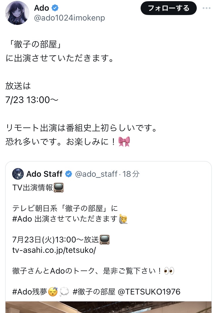 【テレビ】Adoちゃん、徹子の部屋に出演します!