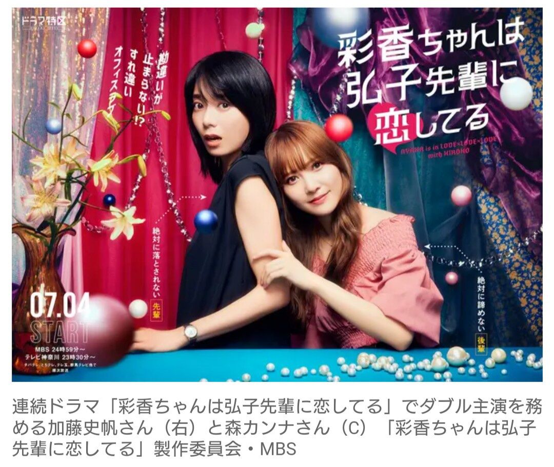 アイドルグループ「日向坂46」の加藤史帆さんと俳優の森カンナさんが、7月4日深夜からMBSのドラマ特区枠(木曜深夜0時59分)で放送される連続ドラマ「彩香ちゃんは弘子先輩に恋してる」でダブル主演を務めることが分かった。加藤さん、森さん共に連ドラ初主演となる。